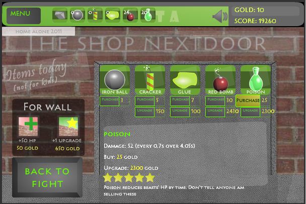 Skid will face those bug-beasts tonight, as his parents went out. Help Skid stop those beasts by clicking to throw items against them and go to the shop "Nextdoor" to purchase or upgrade items. Don't let them in!