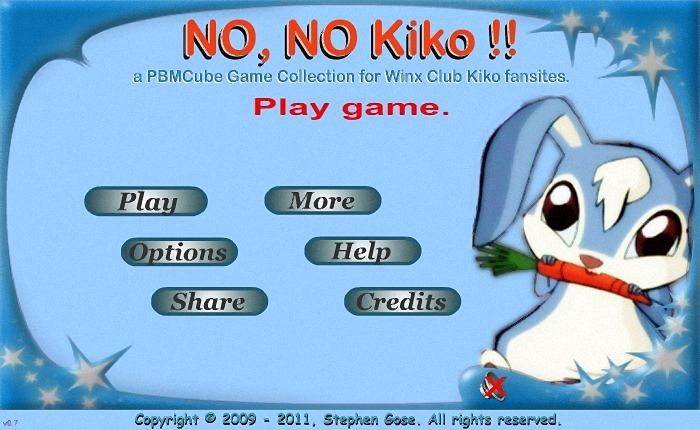 "No No Kiko!!" is Winx Club kiko adventures that combines frogger-style action arcade with a role-playing adventure games. Help get Kiko across the busy street, and then discover hidden passages to 5 more kiko adventures. *** Save and Load features (login required) *** Win awards, badges, trophies and 1-month free club membership. *** choose your level of difficulty in No No Kiko adventures; *** challenge your friends for highest international scores; *** 36 languages supported; *** 5 levels; 5 hidden secret adventure games. *** new surprises monthly! Use arrows keys to move. Cross the street. Cross the river.Enter a secret cave for 5 more unique fun adventures.Beware of danger!