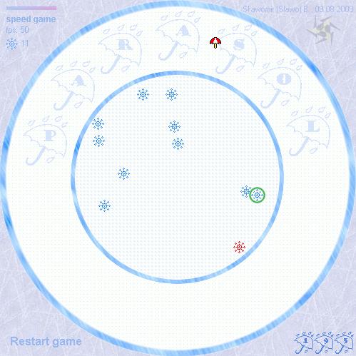 You are the paraglider, which for unknown reasons, fell into a deep ice hopper. You fall down holes, holding an umbrella. You have to control it using the mouse to the green snowflake was the farthest away from you - so you earn points. By pressing enter you can change the green snow flake (- 3 pts.) Unfortunately, every contact with ice or snow flakes that your disaster..