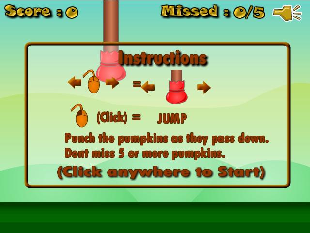 Move mouse to move the punch left and right.nClick to punch the pumpkins that are passing down.nDon’t miss 5 or more pumpkins else the game will be over.