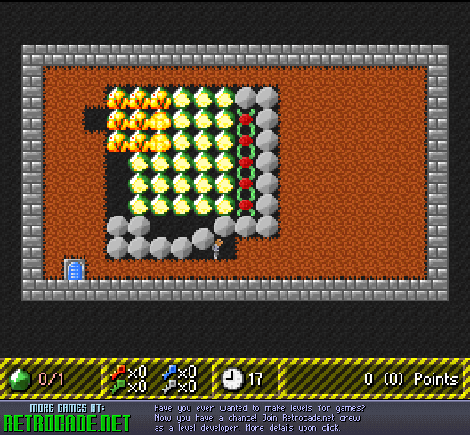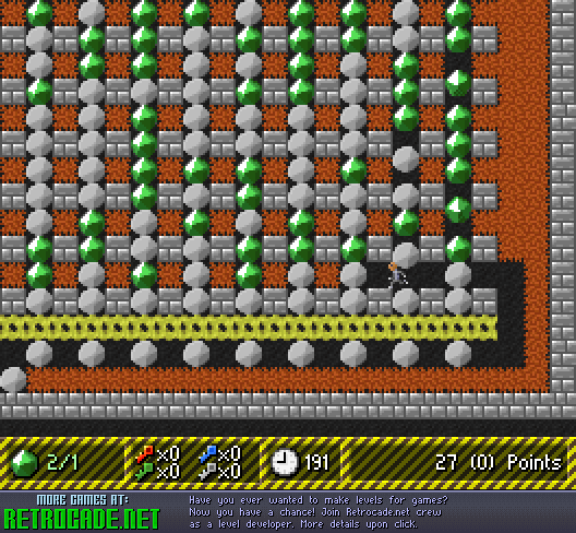 Fresh off the code press from us at Retrocade is Rock Rush, our very own Flash version of the classic Boulder Dash! Dig through bug-infested caves dodging boulders, triggering magic walls, and collecting diamonds until you have enough to open the exit. But it doesn't stop there. Depending on which version of Rock Rush you play there may be even more challenging elements to figure out before those gems come within your grasp...