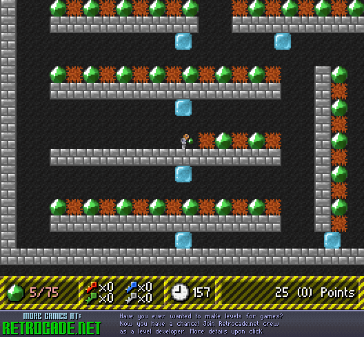 CLASSIC II: Continuing from the first classic levelset, these boards are taken from Boulder Dash II, the official sequel to the original. Will you be able to help our hero grab all those shiny gems and escape without being crushed or exploded? Good luck! Collect the necessary amount of emeralds and then reach the exit. Avoid Blobs and Bugs, don't get crushed by boulders, blown to pieces by bombs and blocked by walls!