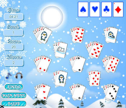 Move all cards to the 4 foundations in this Winter Solitaire game. 1. Move all 52 cards to the foundations in order from Ace to King.