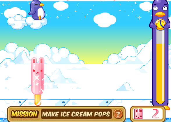 Stay cool by making some delicious frozen ice cream treats. See how many you can make before time runs out! Use your mouse to move the penguin back and forth above the conveyor. Click to drop ice cream at the right moment so it lands on the sticks to make a frozen treat!